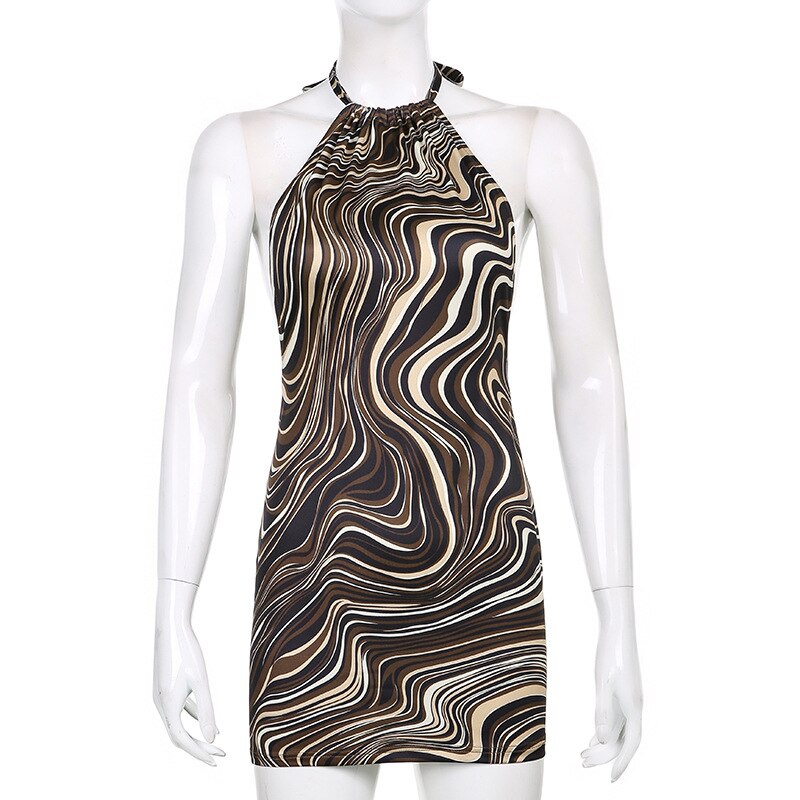 Women's Clothing Water Ripple Print Halter Neck Summer 2021 Sexy Party Dress High Waist Mini Dress Female Clothing Club Fashion