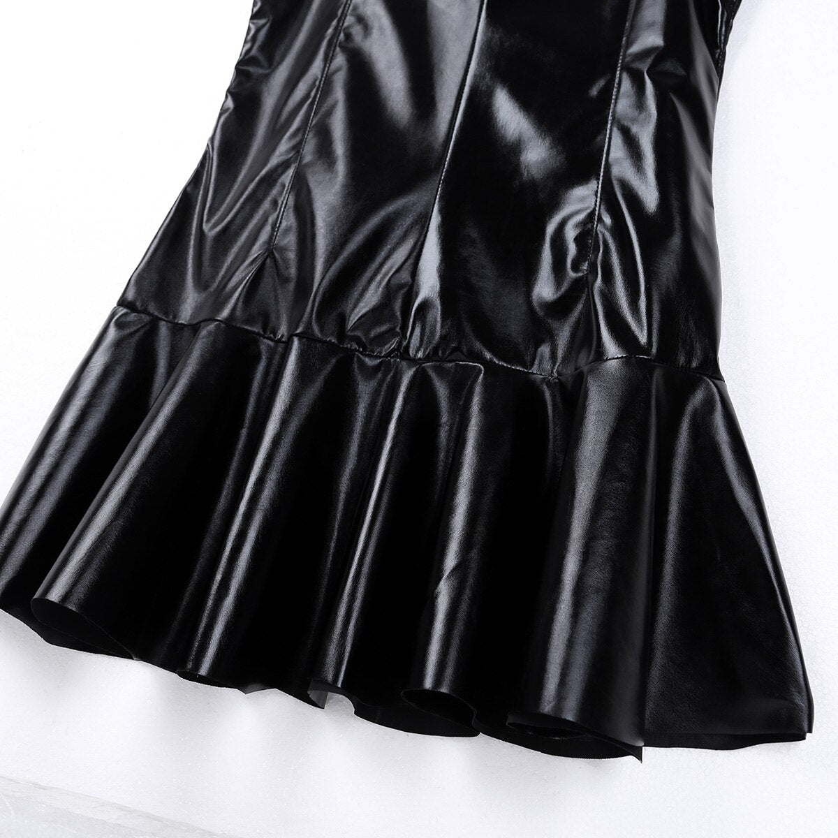 Women Ladies Fashion Stretchy PU Leather Bottom Flare Mini Dress Clubwear.