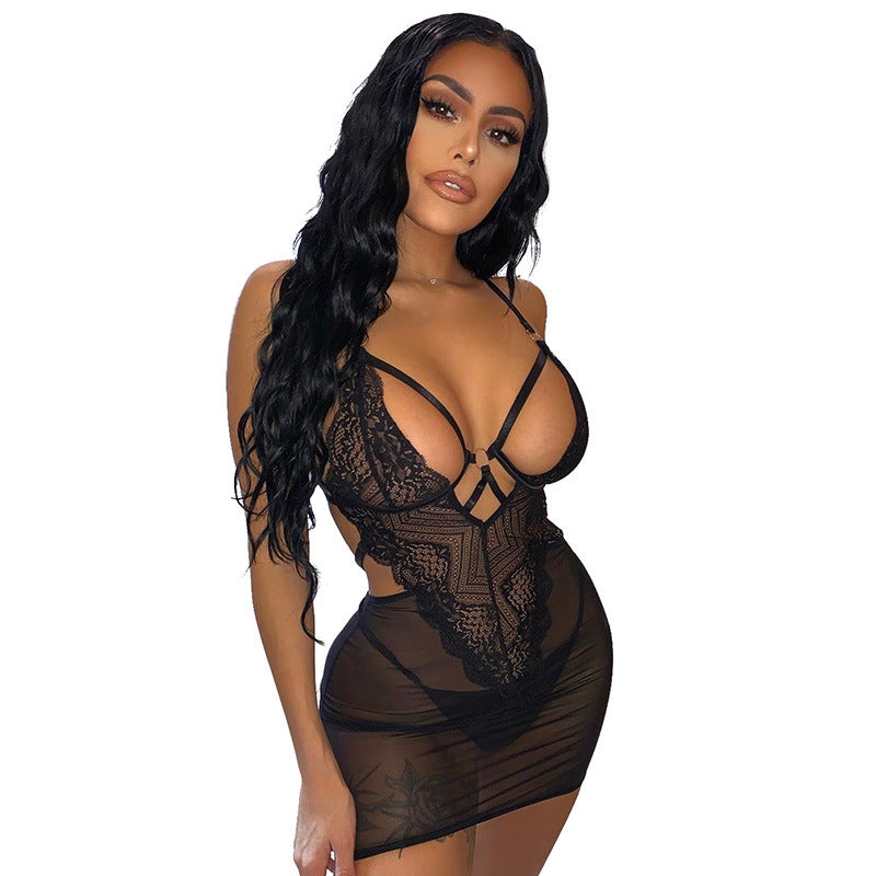Women's sexy lingerie lace stitching mesh hem deep V sling perspective ladies temptation dress femme erotique porno extreme