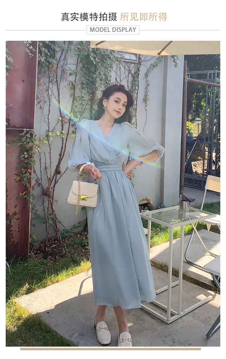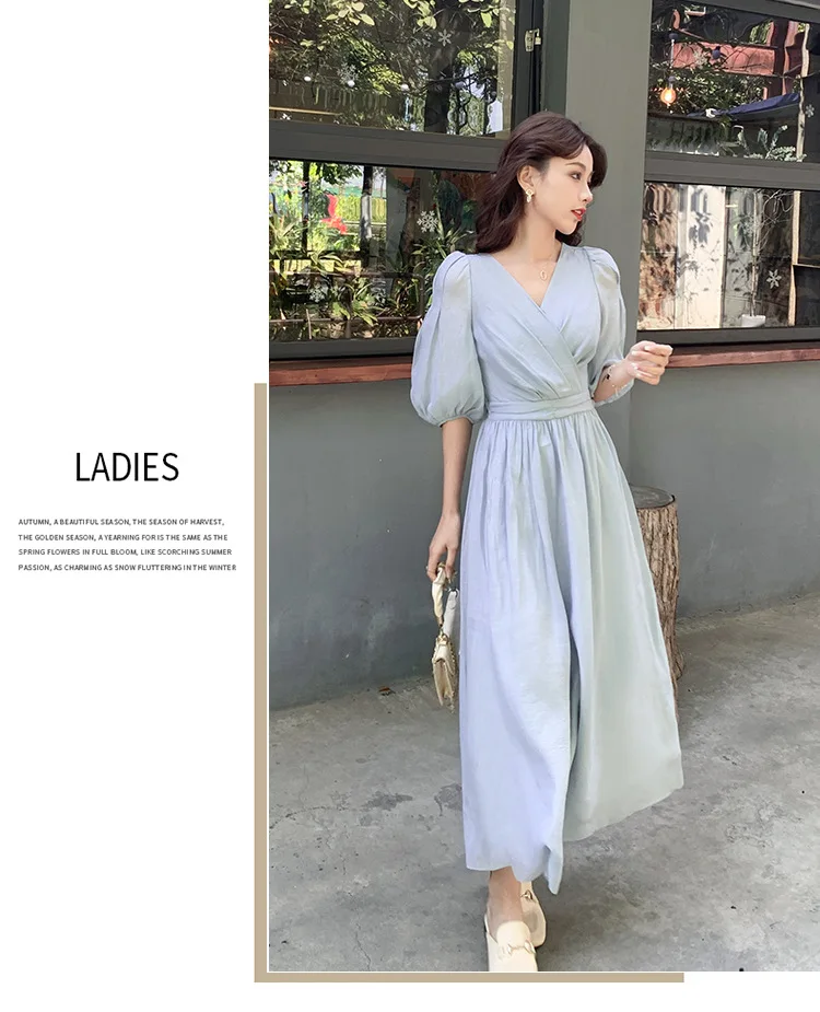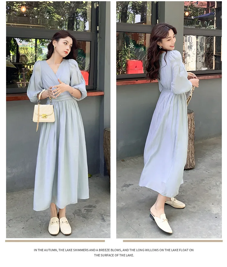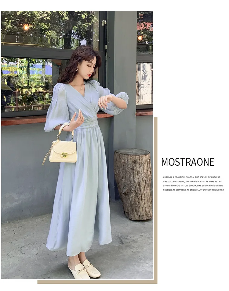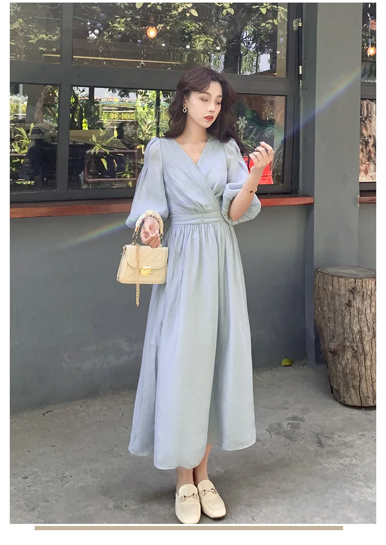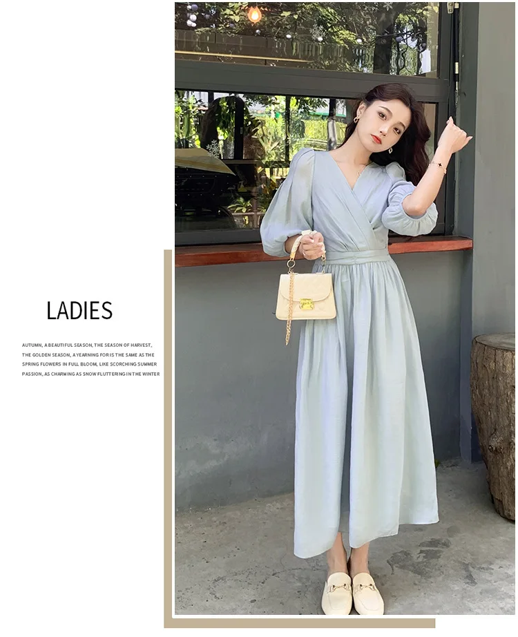 Women Elegant V neck long Dress Fashion Simple Lantern Sleeve Vestdio summer women's dress 2021