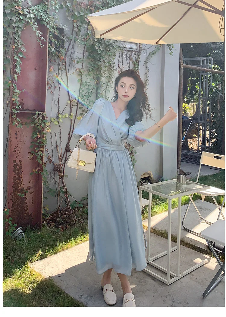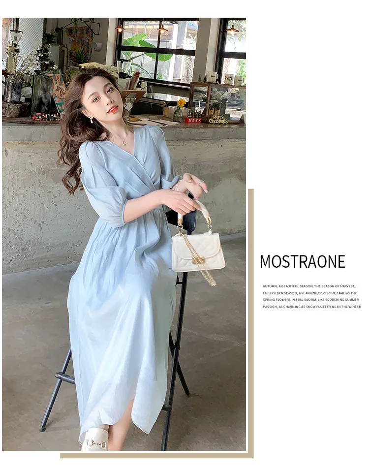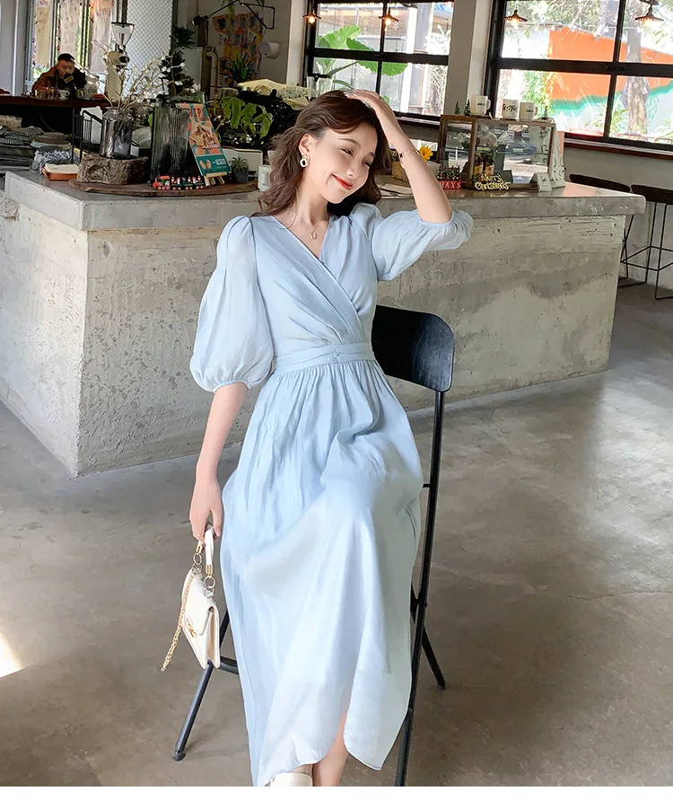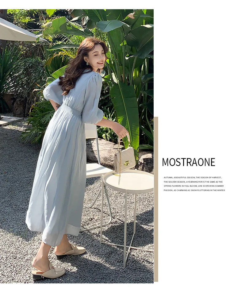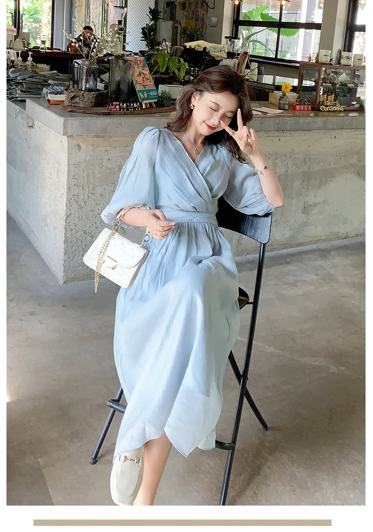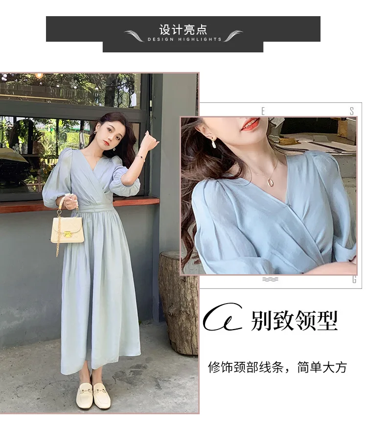Women Elegant V neck long Dress Fashion Simple Lantern Sleeve Vestdio summer women's dress 2021