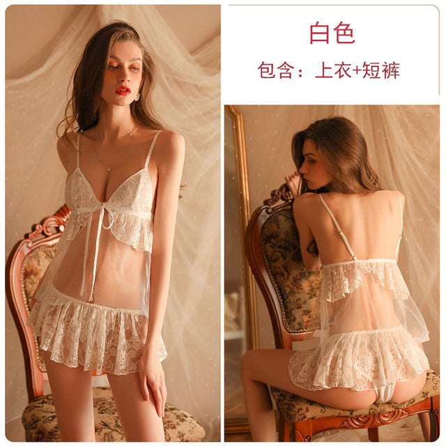 Women Sexy lace Lingerie Set Erotica Gauze See-through Seduction Porno Baby Doll Nightdress Femme Slutty Front Button Dress