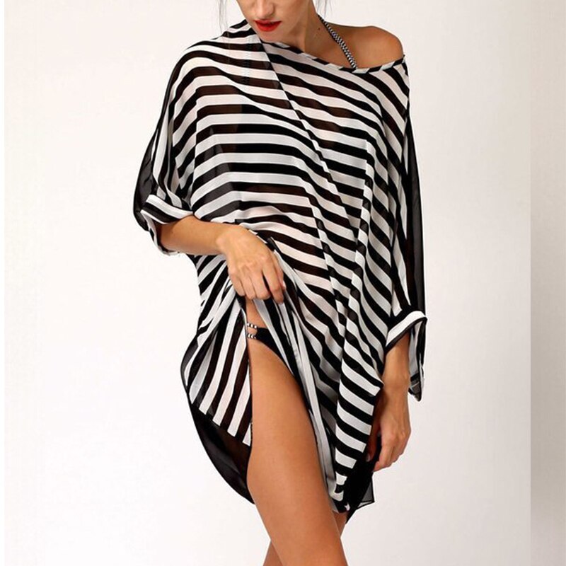 Women Stripe Dress Summer Boat Neck Ladies Blouse Shirt Swimming Tops Striped Bikini Cover Up Swimwear Beach Dress