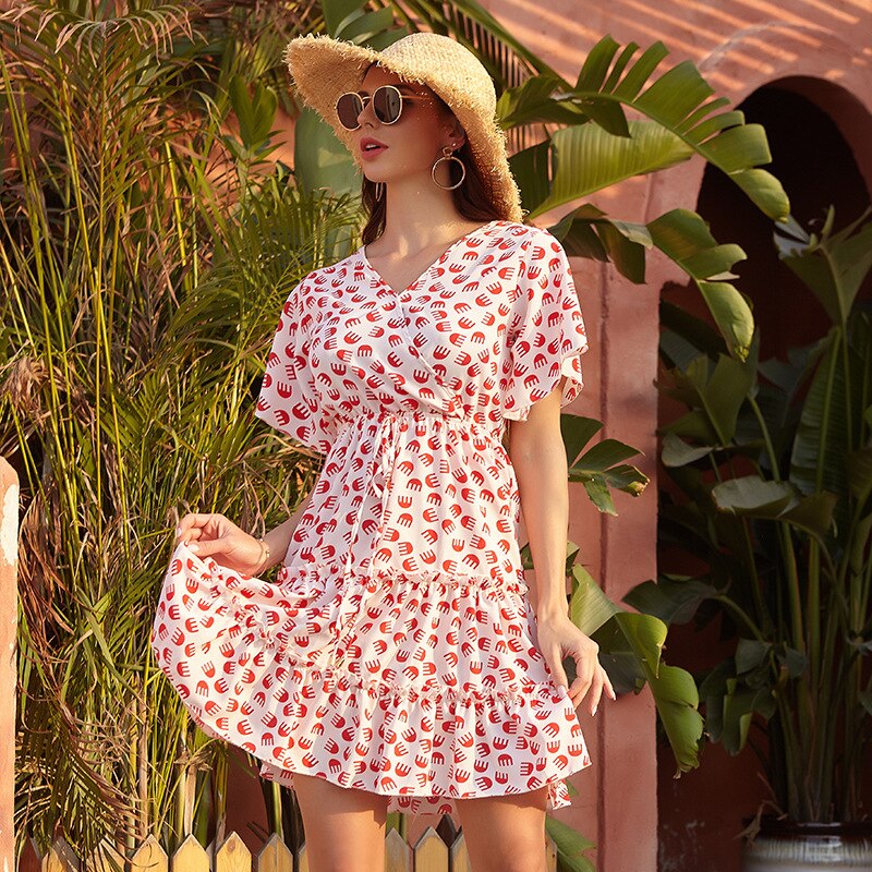 ♥Features: Floral Print, Elegant, Graceful,Swing,Flowy, Frill Trim Tiered, Butterfly Sleeve,Ruffle Sleeve,V-Neck,Wrap Dress,A-Line. classic,classy,flowy,swing,mini,beautiful,ruffle.