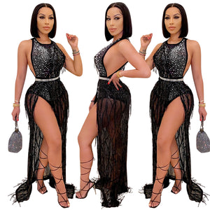 • New fashion clubs hot diamond mesh mesh sexy fringed women two-piece dress