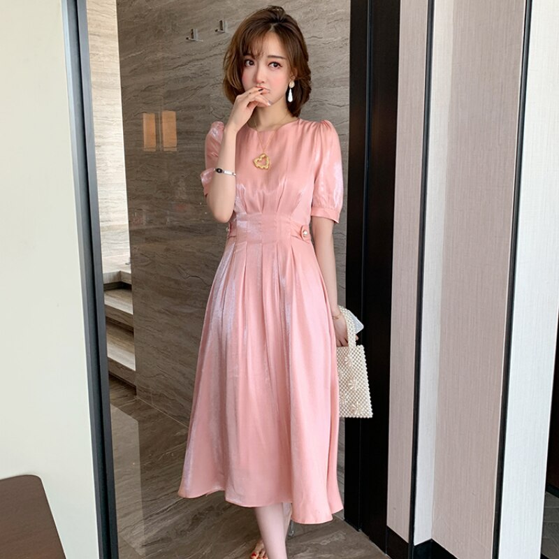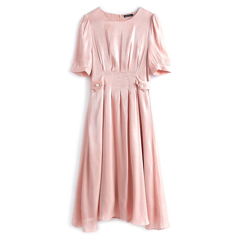 2021 Fashion Elegant Acetate dress Folds High Waist A-Line Dress Women Summer Short Sleeve Round Neck Party Dresses Female
