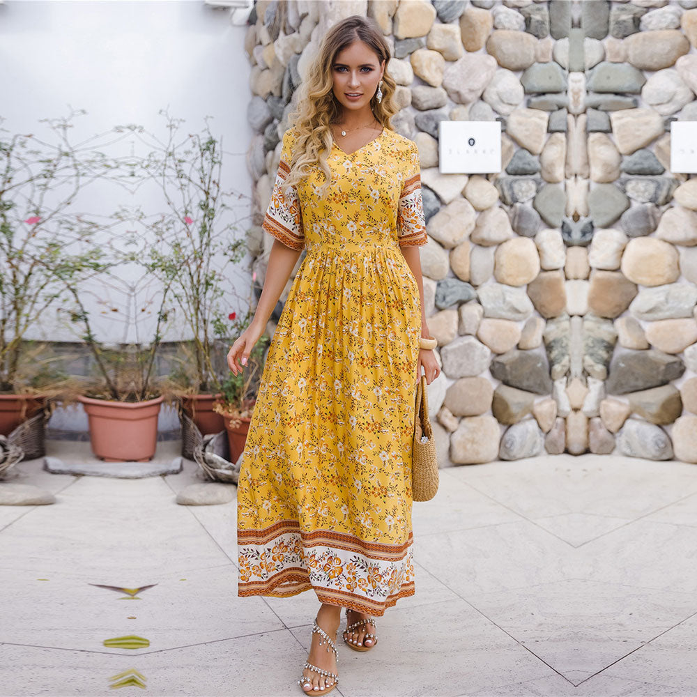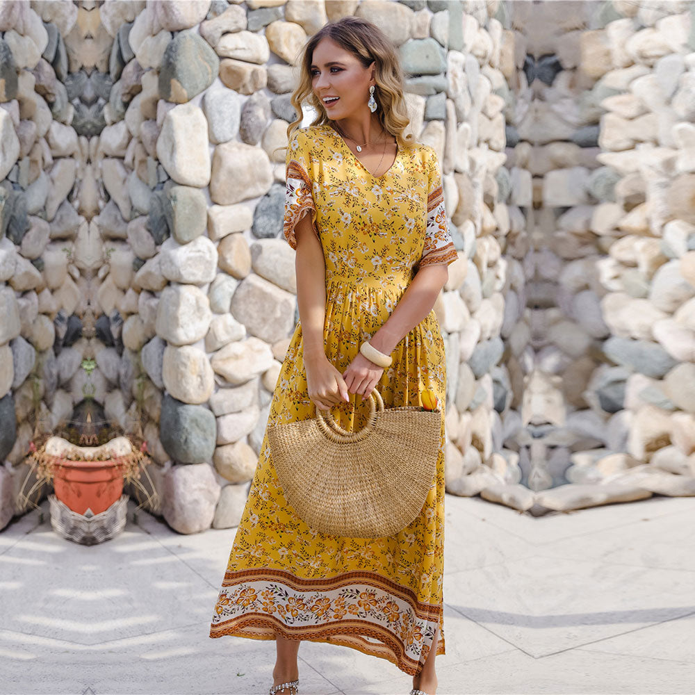 2021 Spring Summer Beach Dress Women Casual V Neck Short Sleeve High Waist Pleated Print Long Dresses Ladies Yellow