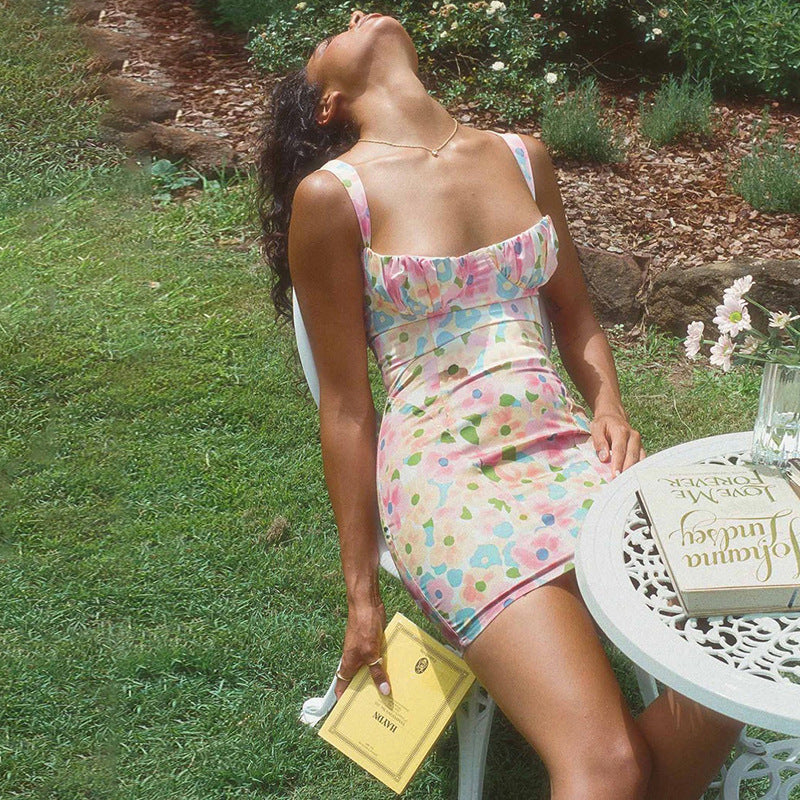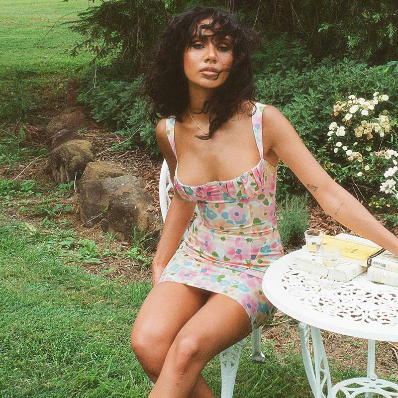 2022 Elegant Print Sexy V-Neck Backless French Mini Dress Club Party Outfits for Women Summer Sleeveless Dresses Casual Vacation