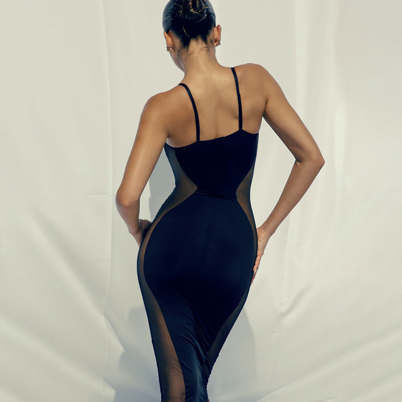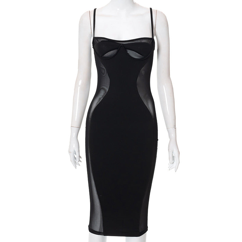 2022 Summer Sexy Black Mesh Perspective Stitching Backless Midi Dress Club Party Outfits for Women Elegant Straps Prom Dresses