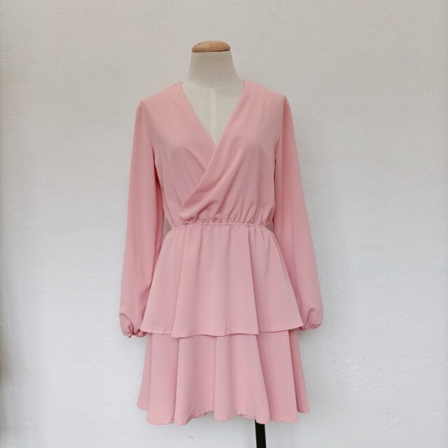 Casual Lantern Sleeve Ruffle Mini Dress Women Sexy V-Neck Elastic Waist Solid Dresses 2021 New Fashion Sweet A Line Party Dress
