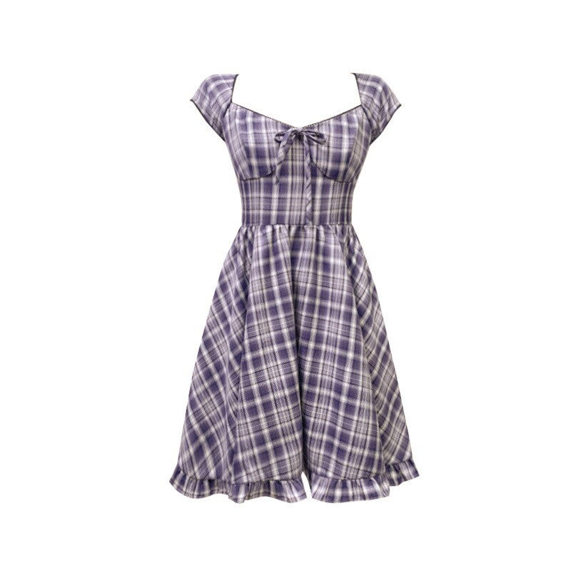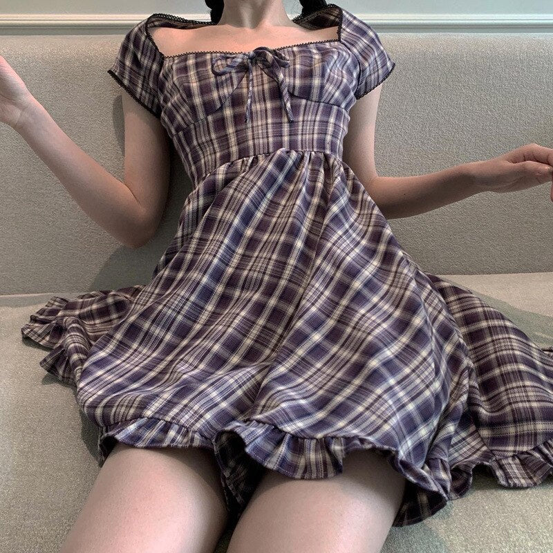Goth Gothic purple Plaid Black Lace Up Women Mini Dresses Harajuku Short Sleeve ALine Party Dress Summer Fashion Streetwear 2021