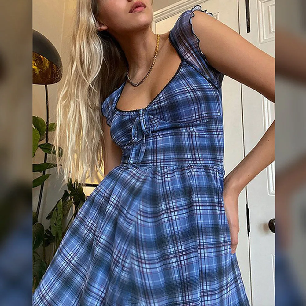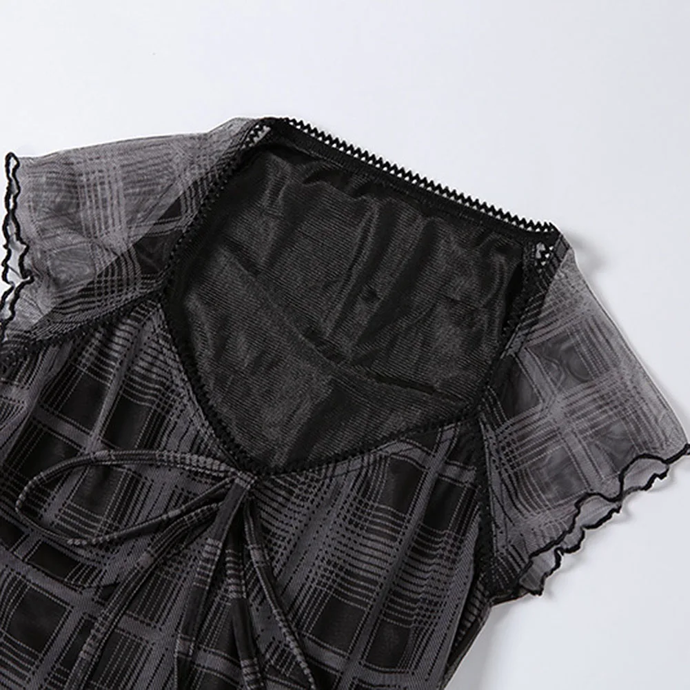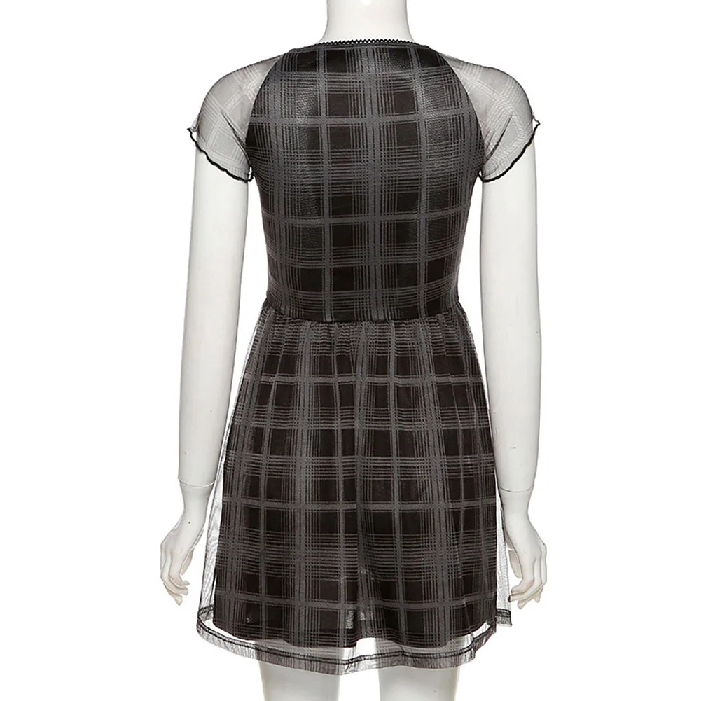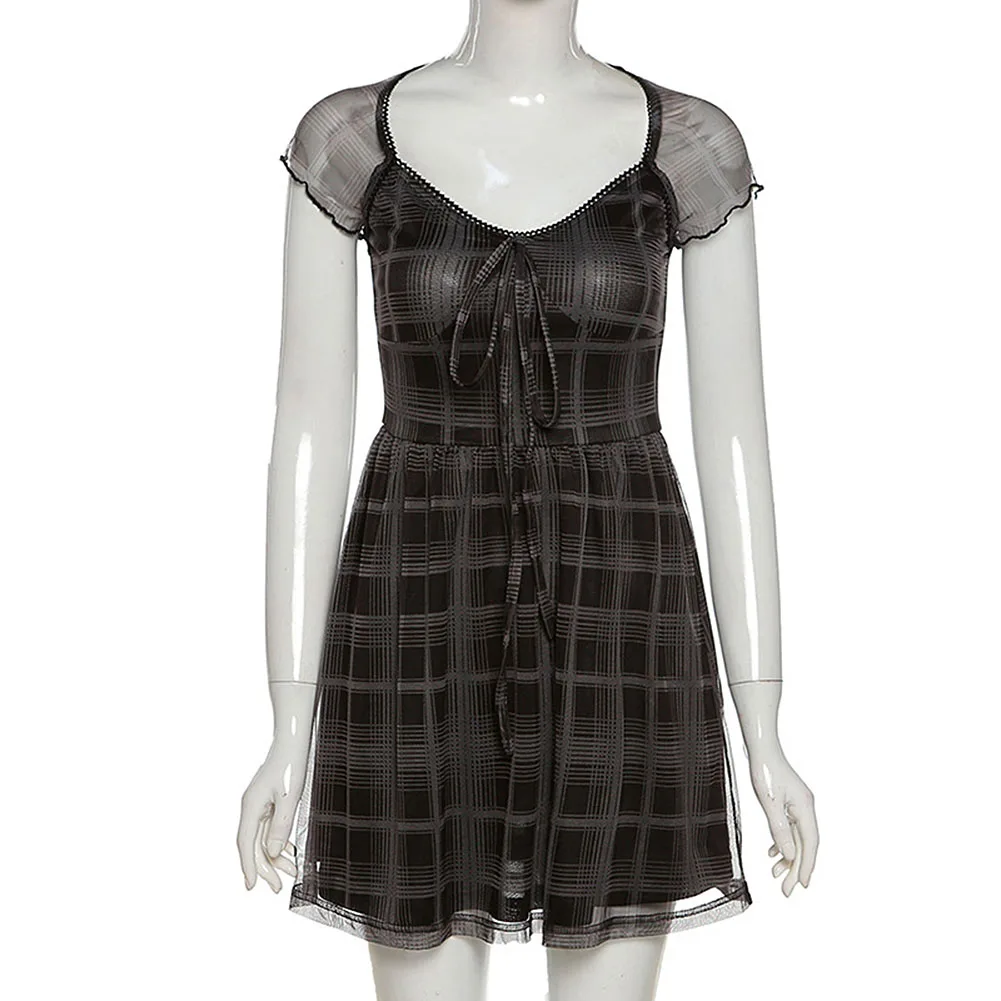 Gothic Plaid Black Lace Up Mini Dresses Women Harajuku E-girl Short Sleeve Party Cyber Y2k Dress 90s Aesthetic Girls Streetwear