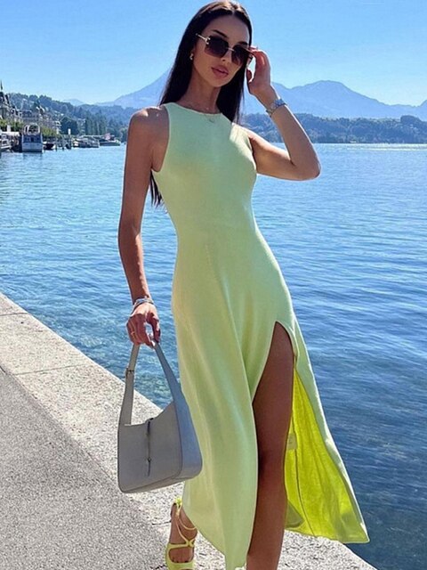 Knitted Split Sleeveless Midi Women Dress Sexy Solid Slim Hip Package Dresses 2023 Spring Summer Ladies Fashion Vestido