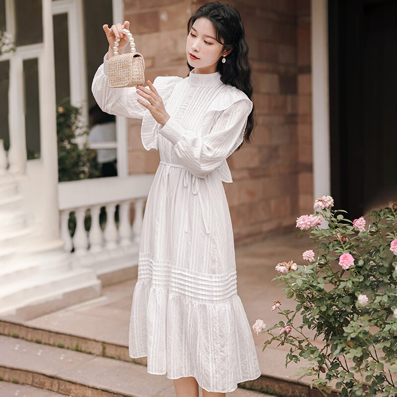 Korean Loose Cute White Dresses For Women 2021 Ruffle Stitching Stand-up Collar Small Fresh and Sweet Dress Roupas Femininas