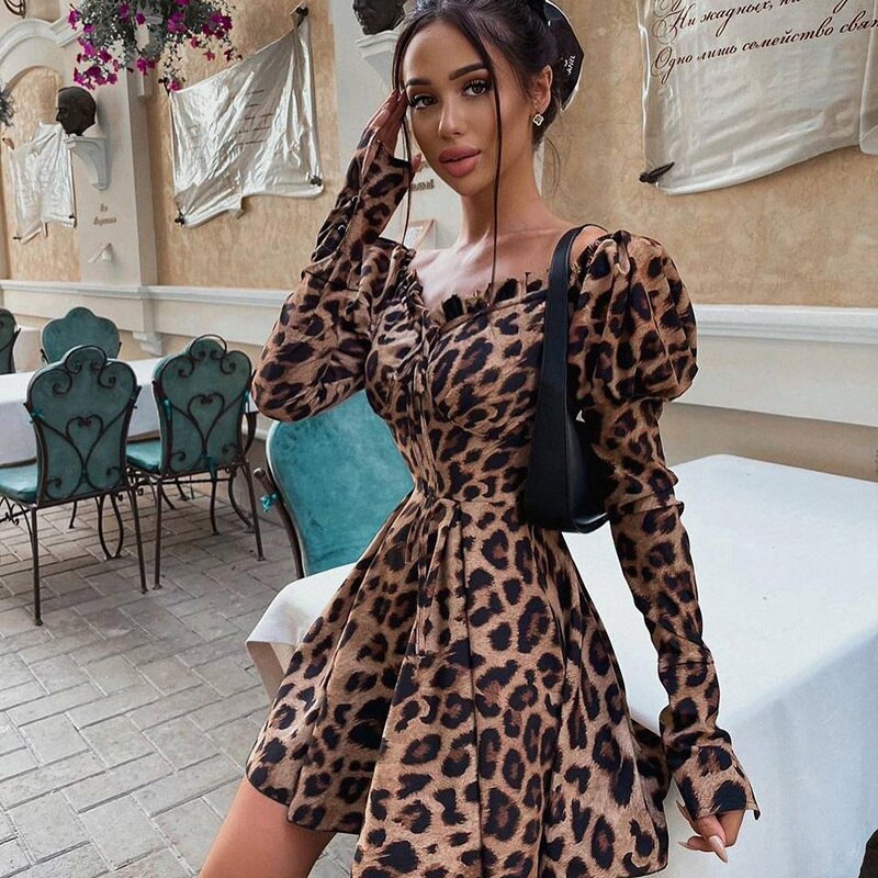 Leopard Long Sleeve Dress One Word Collar Low Neck Mini Dress Clubwear Elegant Puff Sleeve Sexy Party Dresses Woman Dress