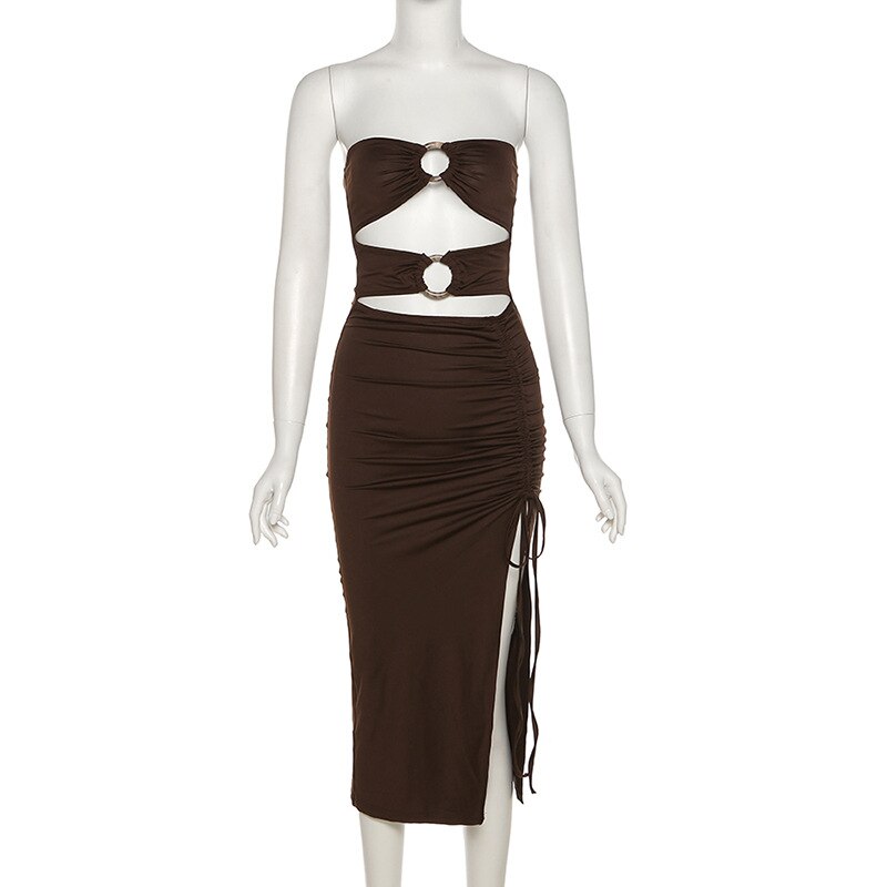 Sexy Off Shoulder Backless Bodycon Midi Dress Women Elegant Hollow Out Drawstring Slit Ruched Prom Club Party Dresses 2021Summer