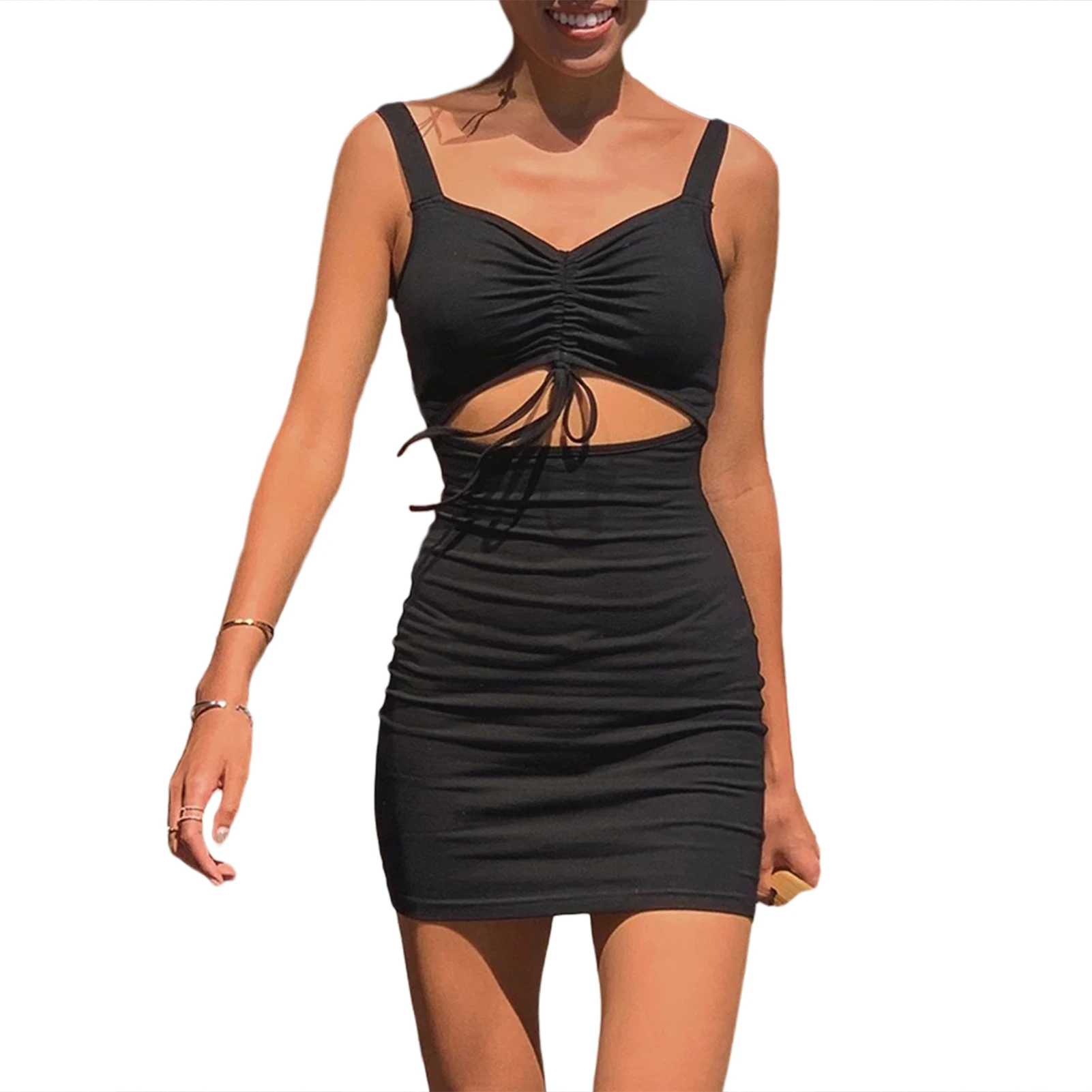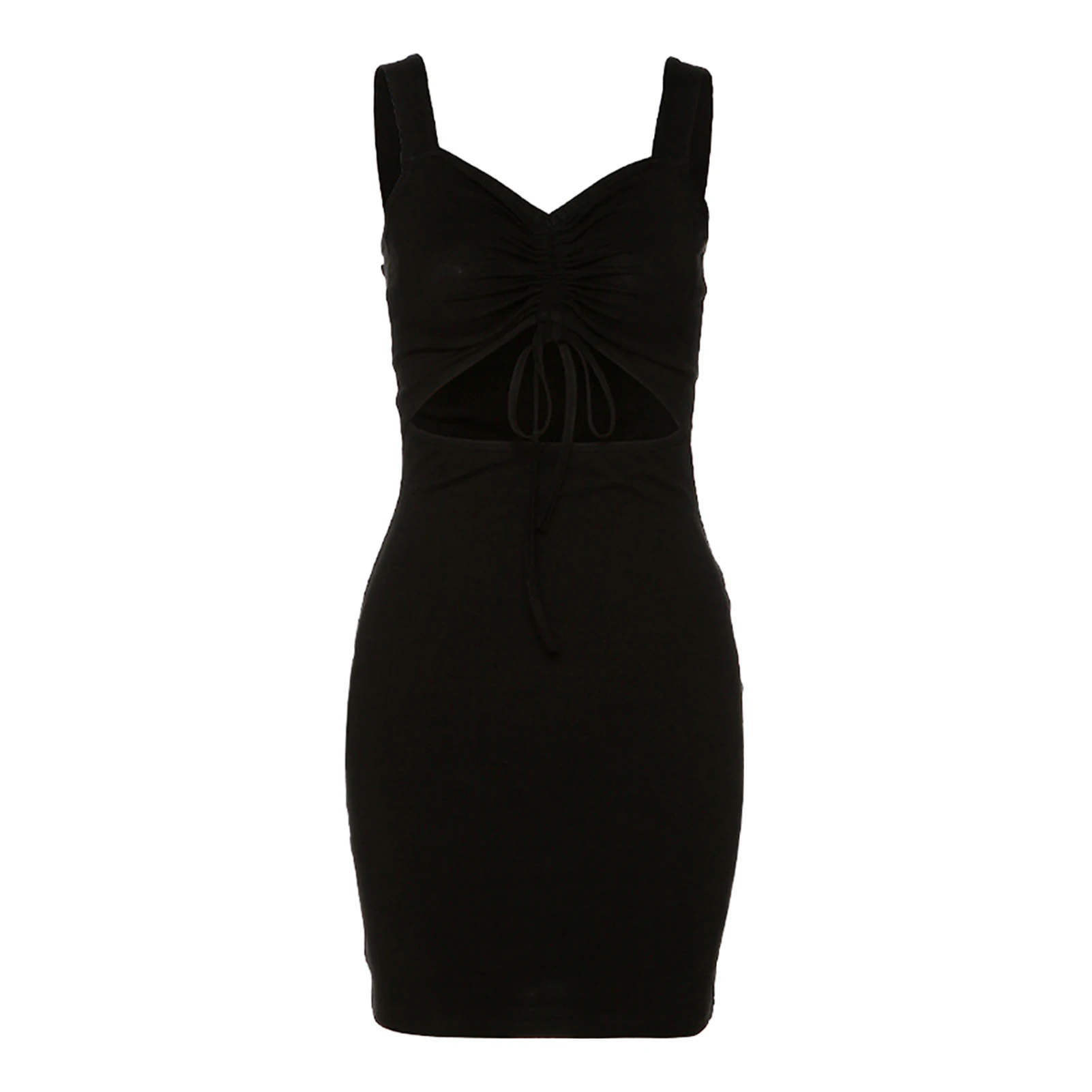 Chic black mini dress with hollow out design at front of the waist for party, and nightclub. The slim silhouette, V neck, sleeveless, high waist and adjustable drawstring front make it sexy and cool.