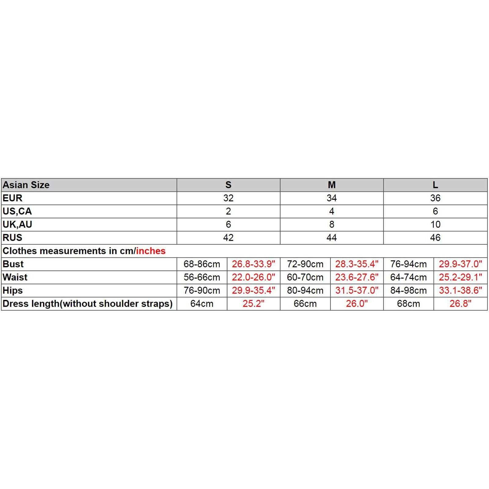 Dress length(without shoulder straps) 64cm 25.2" 66cm 26.0" 68cm 26.8"