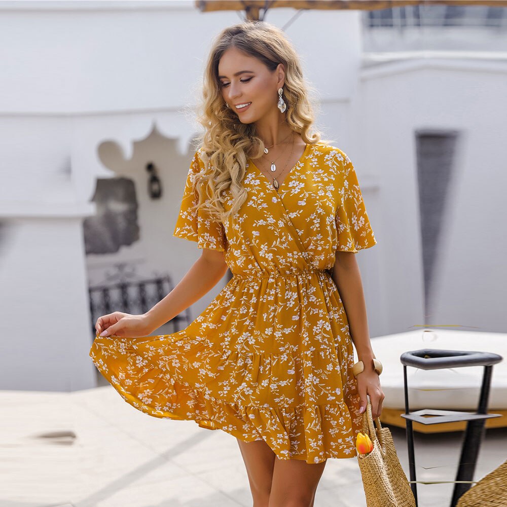 Spring Summer Sexy Short Floral Dress Women 2021 New Butterfly Sleeve V Neck Print Party Dresses For Women Casual Ruffles
