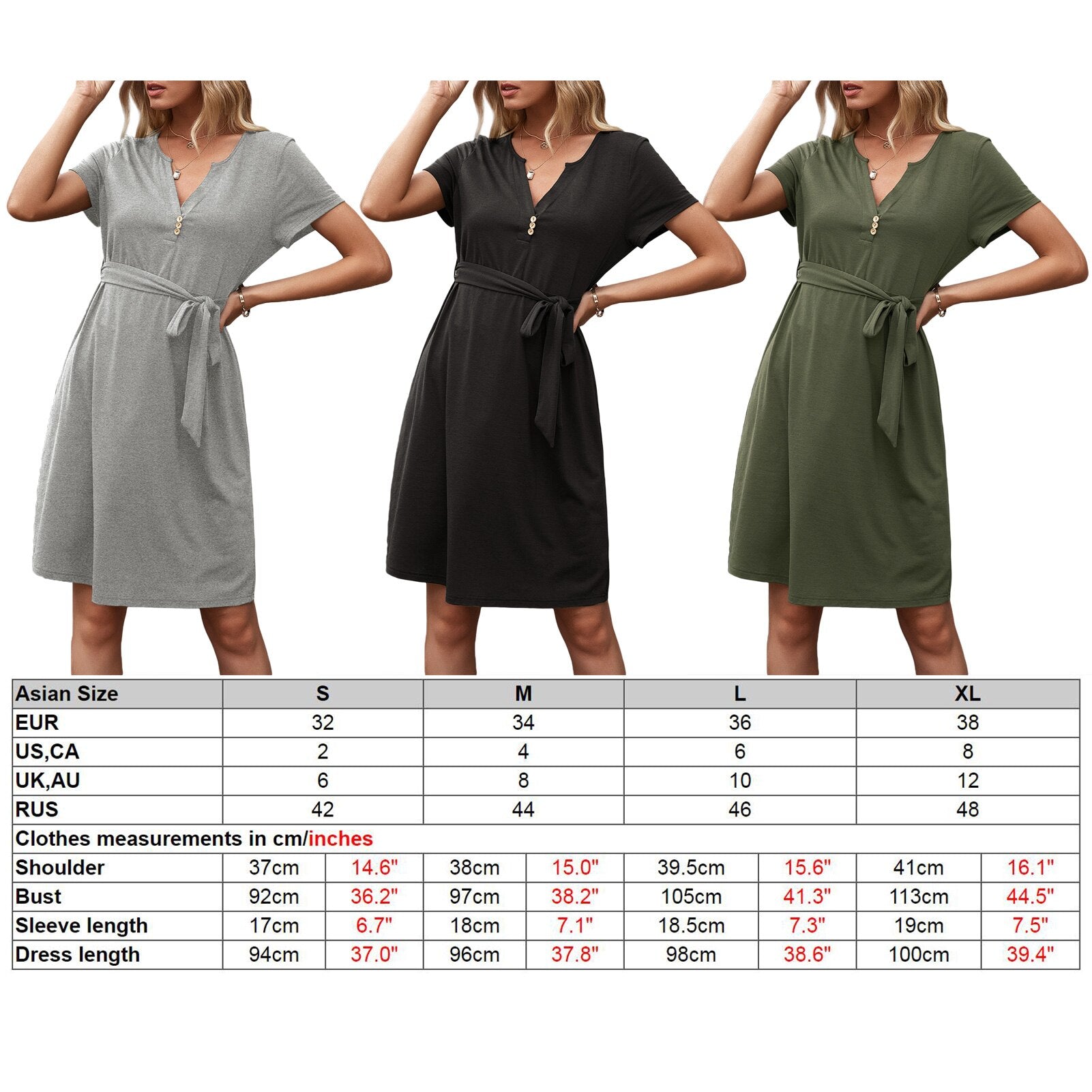 Solid shift dress with self-tie waist strap for streets and holiday. It has V neck, short sleeve and high waistline, bringing a chic and casual style for summer.
