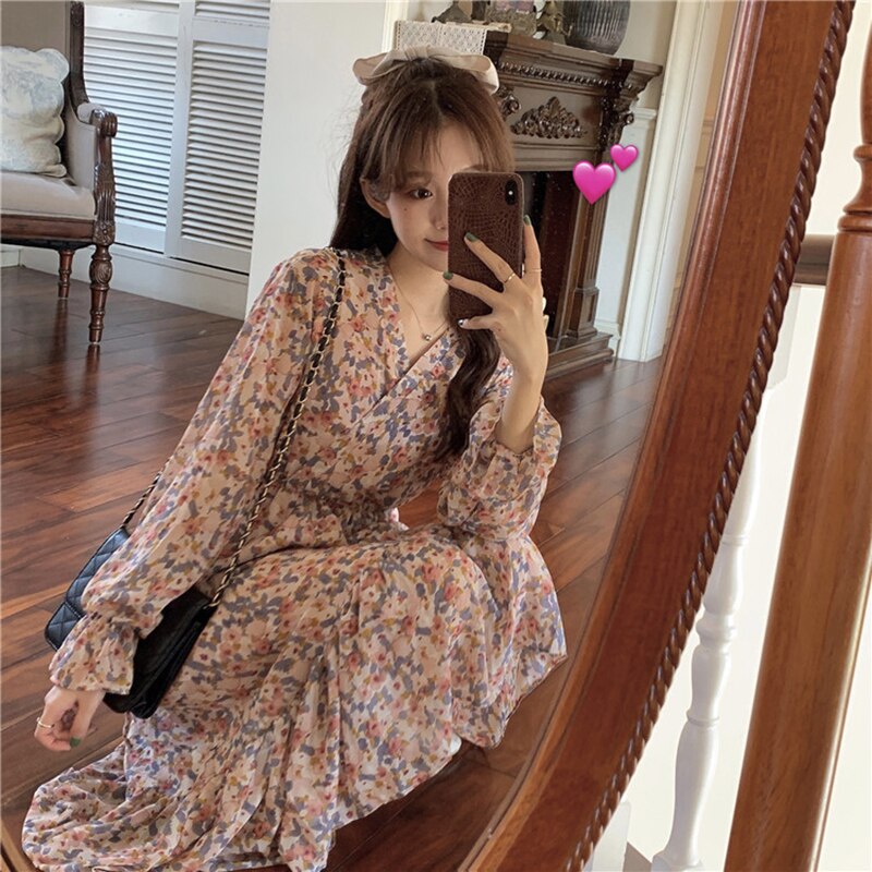 Women Floral Chiffon Dress Sexy V-Neck Bottoming Sweet Skirt Spring Autumn Fashion French Temperament Dresses Long-Sleeve Dress
