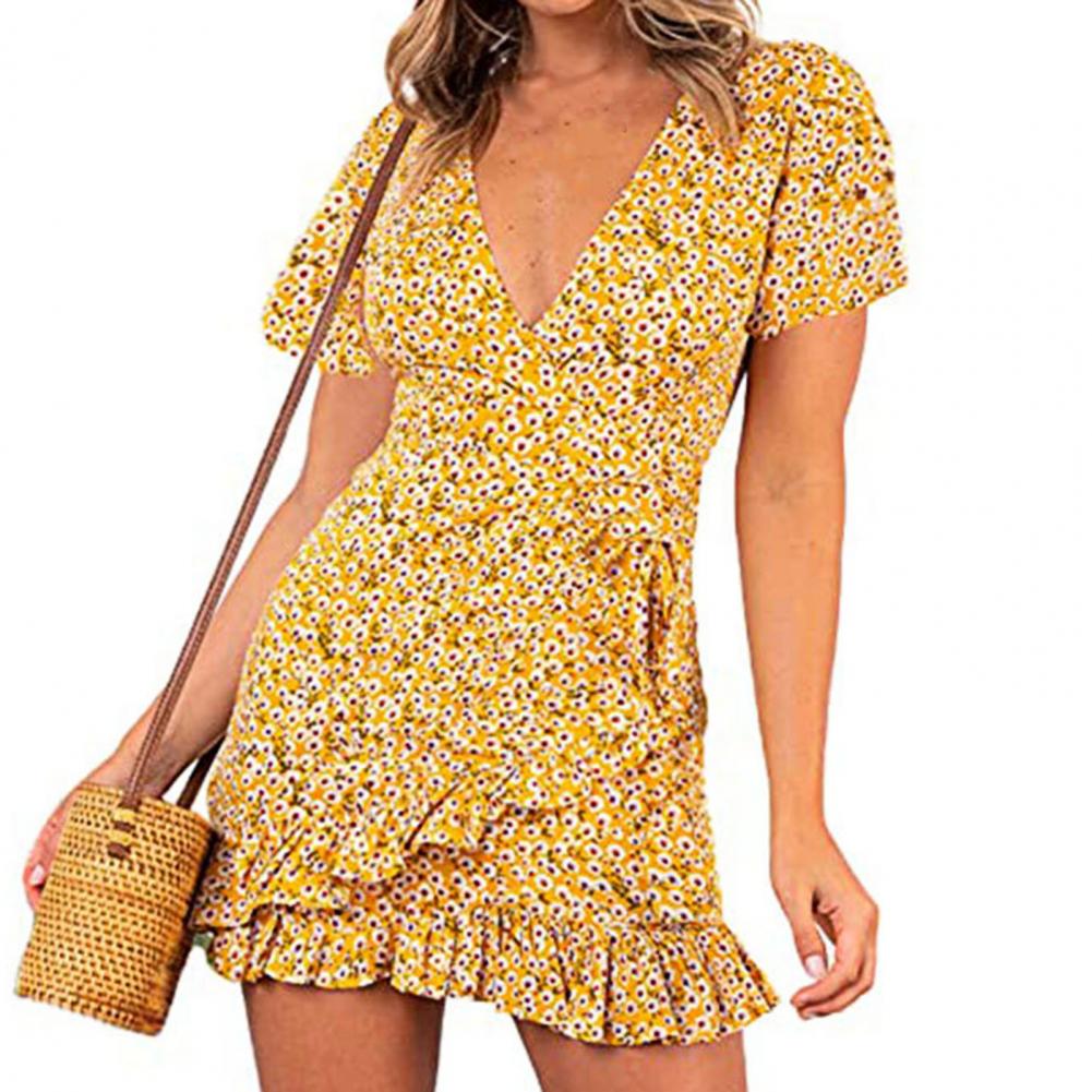 Women Print Short Sleeve Wrap Front V Neck Lacing Ruffle Hem Mini Dress for Date