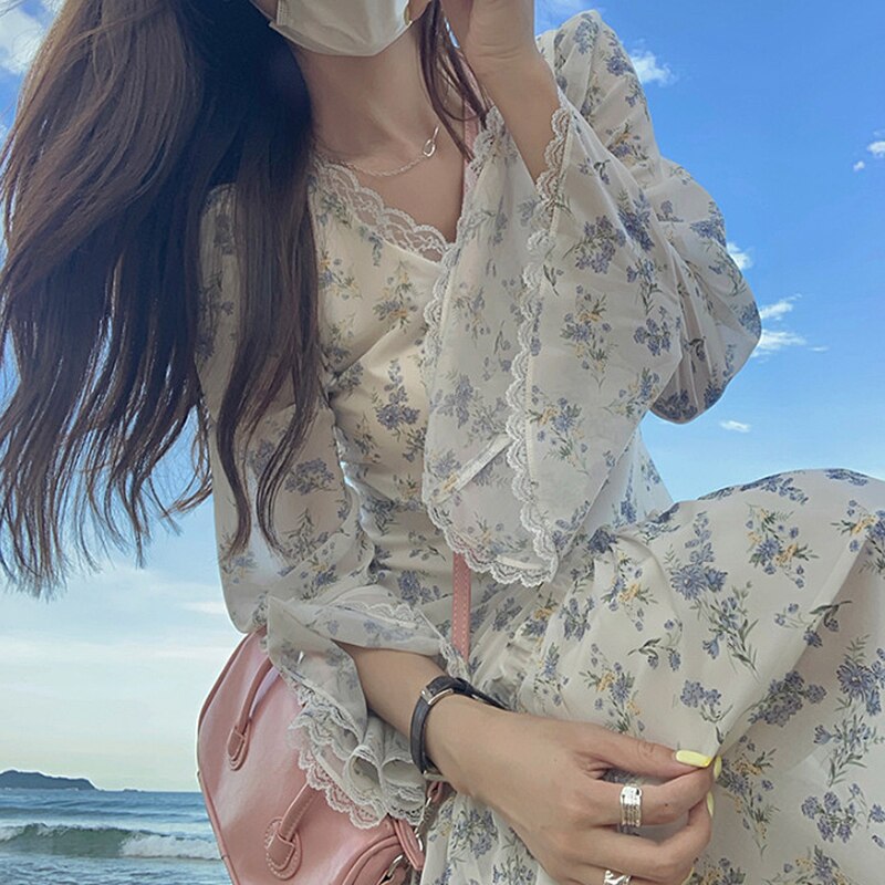 Women Sexy Lace Dress French Floral Gentle Dresses V-Neck Chiffon Bell Long-Sleeve Dress Autumn Fashion Temperament Long Skirt