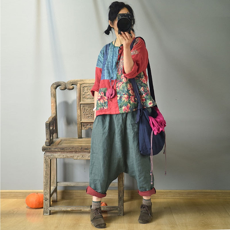Women Spring Autumn Patchwork Linen Blouse Loose Tops Female Spliced Flax Dresses Female 2020 Linen Shirt