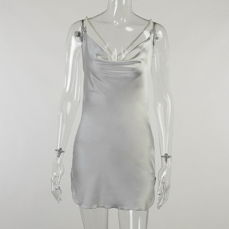 Women Summer Party Dresses Silk Strap Female Sleeveless Mini Dresses Backless Women Sexy Robe Criss Front Pearl Evening Vestido