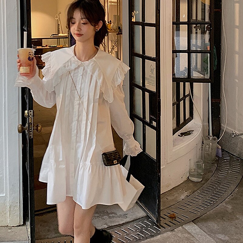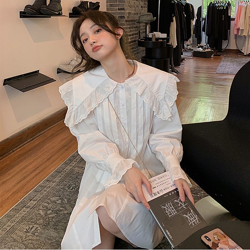 Women White Shirt Dress Sexy V-Neck Fashion Retro Bottom High Waist Dresses Thin Long-Sleeve Autumn Temperament Midi Dress