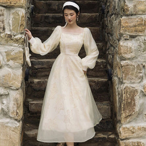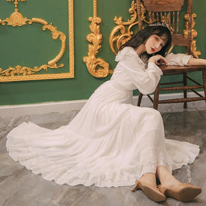 • Large Size White Long Dress Elegant Lady Vintage Square Collar Lace Lantern Sleeve Ruffles Bottom Retro Fairy Princess Dresses