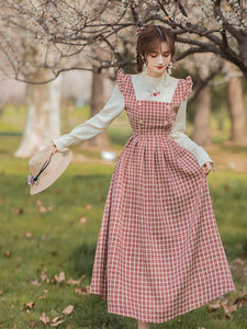 • Cottage Style Red Plaid Dress Woman Japan Mori Girl Knitted Embroidery Flower Loose Casual Vintage Lady Midi Dresses Faldas