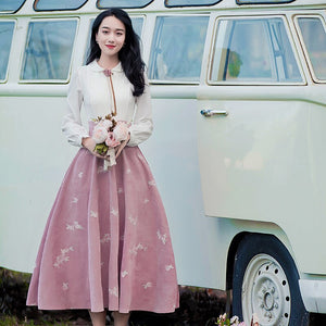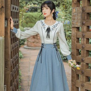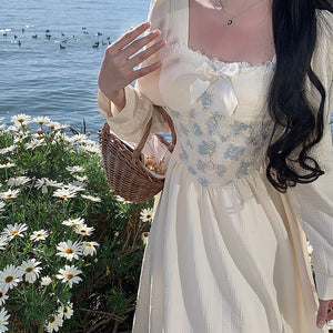 • French Style Vintage Woman Dress Sweet Embroidery Peter Pan Collar Lantern Sleeve Bandage Mori Girl Dresses Vestidos Largos