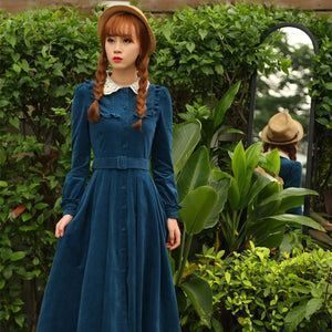 • Retro Victorian Style Blue Corduroy Dress Woman Vintage Peter Pan Collar Long Sleeve Elegant Midi Dresses With Belt Robe Vestido