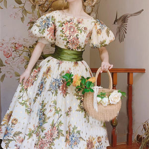 • Summer Vintage Princess Dress Woman Retro Royal Print Flower Puff Sleeve Lace Gorgeous Dresses For Party Night Vestido Festa