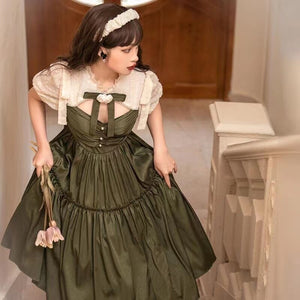 • Sweet Lolita Princess Dress Woman Summer Japan Style Army Green Beading Puff Sleeve Mori Girl Dresses Vintage Vestido Curto