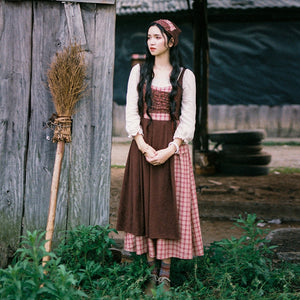 • Vintage Style Prairie Chic Mori Girl Dress Cotton Linen Patchwork Plaid Retro Forest Women Maxi Dresses Vestidos Faldas Autumn