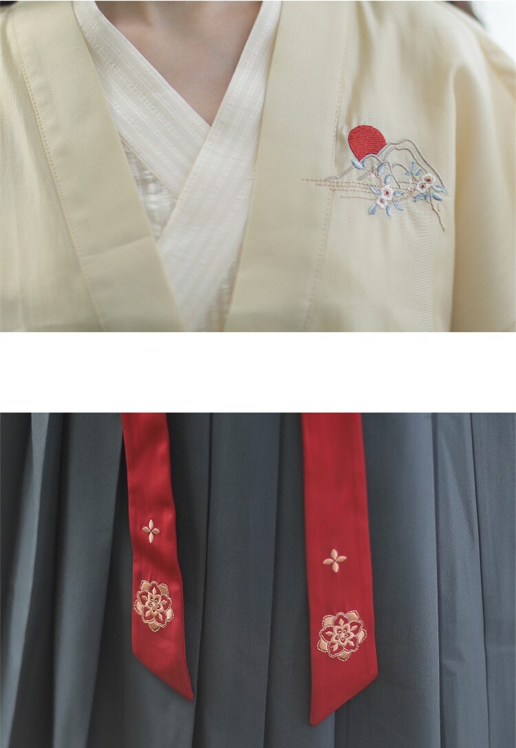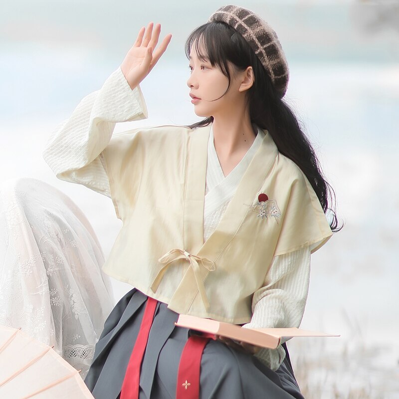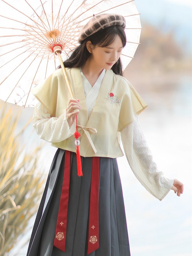 Chinese Style Embroidered Retro Hanfu Three Piece Set Women Diagonal Lace-up V-neck Blouse+Crop Vest+Streamer Pleated Dress Suit