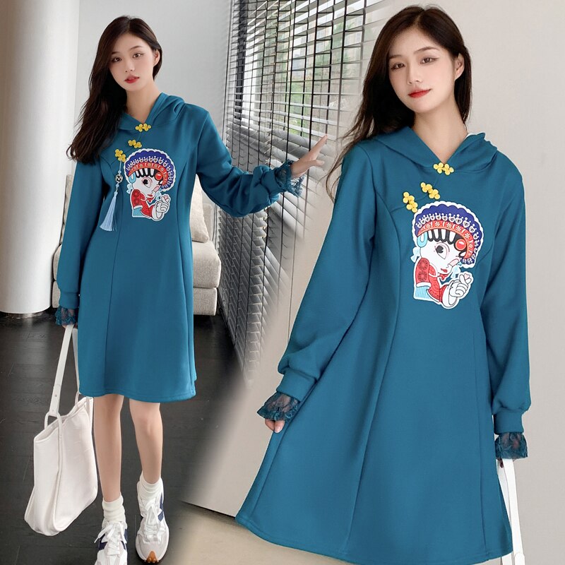 Lace Patchwork Long Sleeve Retro Buckle Hooded Sweater Women Winter Thicken Chinese Style Cheongsam Hoodies Female Casual Top