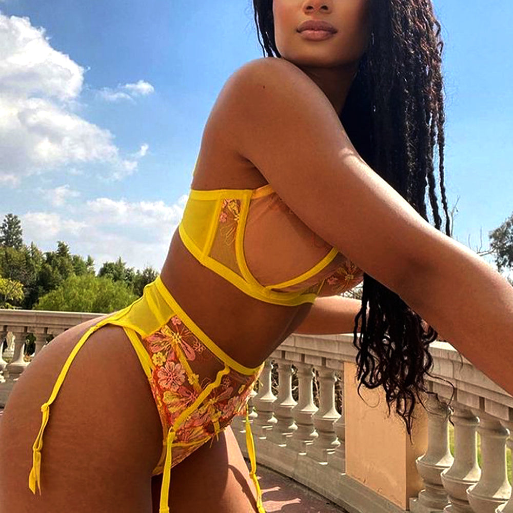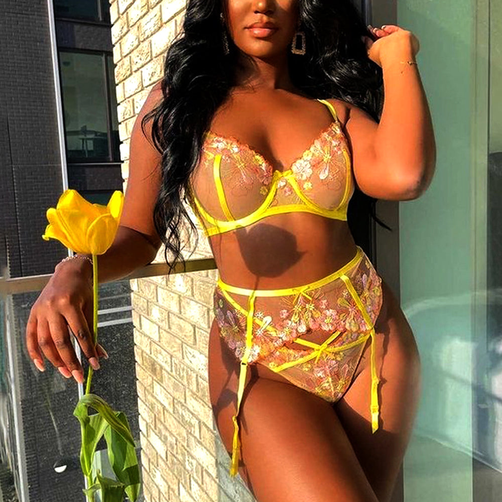 3 PCS Set Women Sexy Floral Embroidery Transparent Underwear Garters Underwire Bra and Briefs Set Sensual Lingerie Exotic