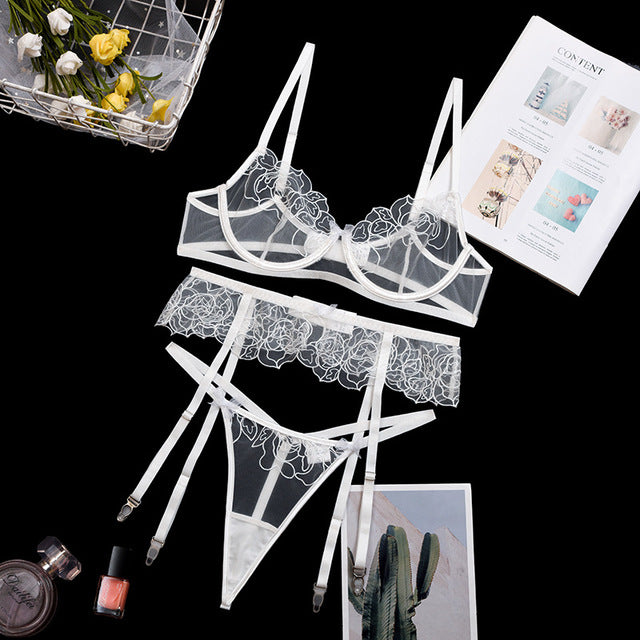3 PCS Set Women Sexy Lace Embroidery Underwear Transparent Erotic Costumes Garter Sensual Lingerie Exotic See-through Thong Suit