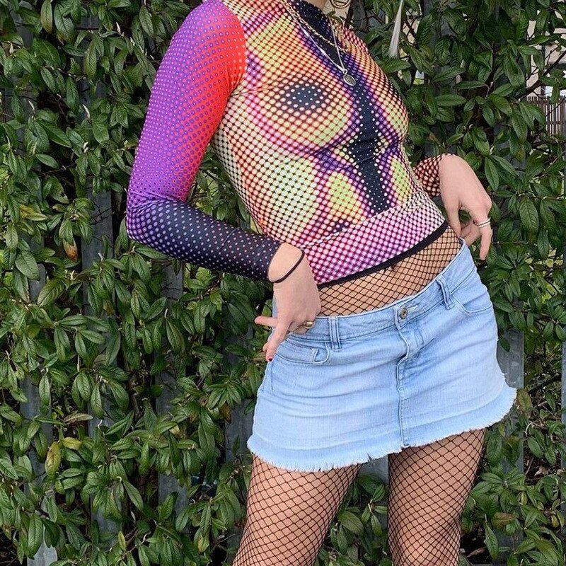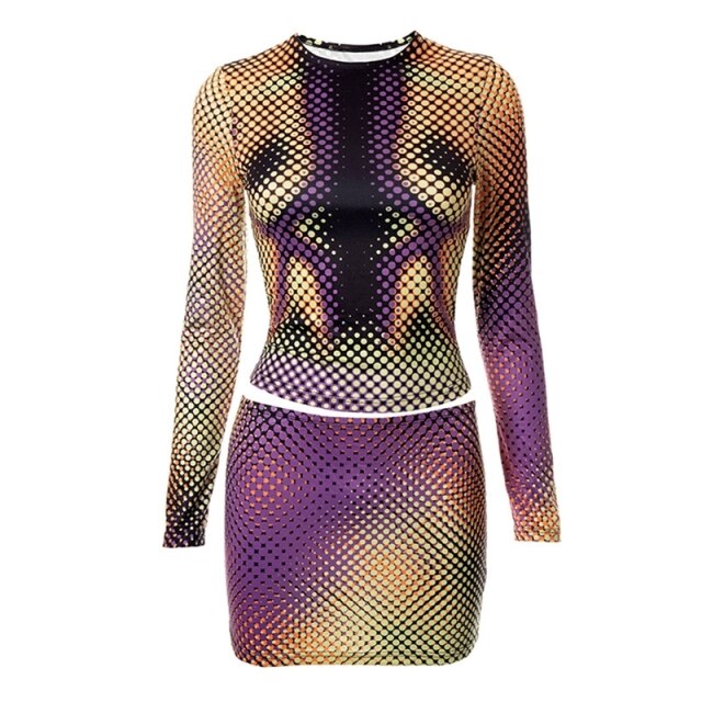Autumn 2 Pieces Set Women Dots Print Stretchy Long Sleeve Crop Top T-shirt and Mini Skirt Bodycon E-girl Gothic Matching Suit