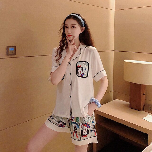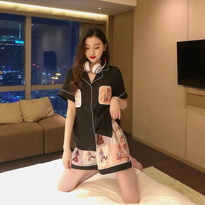 Satin Underwear  Pajamas Set Women Summer Long Sleeve Shorts Cute  Anime Pajamas Thin Section Out Home Clothes Two-Piece Set
