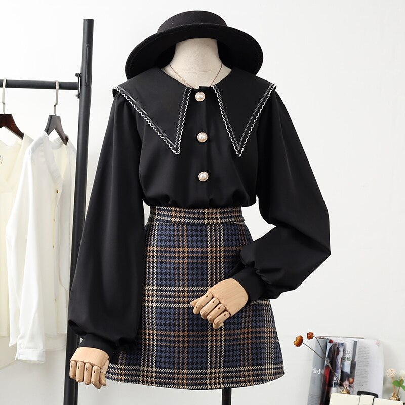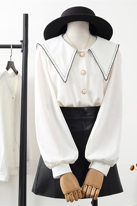 Turn-Down Collar Women Shirts Summer New 2021 Button Long-Sleeved Elegant Office Lady Solid Pearl Outwear Coats Tops
