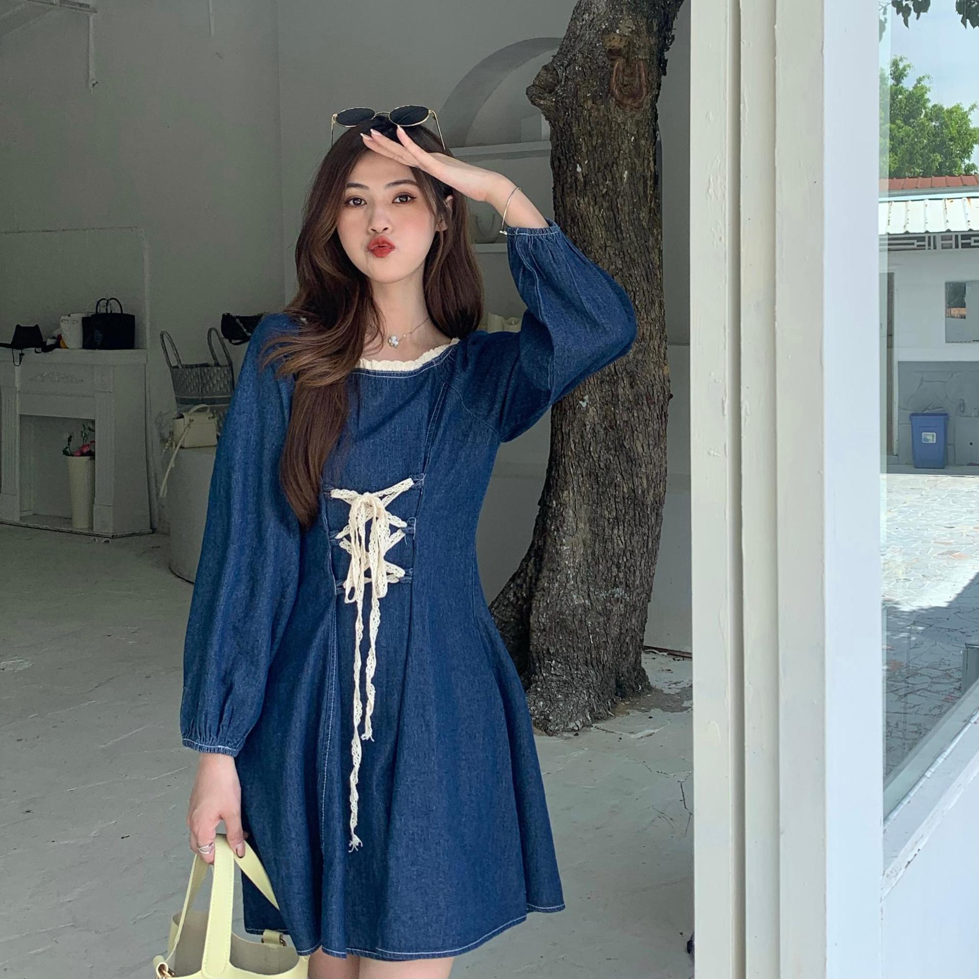 Autumn Long Sleeve Denim Dress Women Lace Patchwork Square Neck Puff Sleeve Mini Dress Teen Girls Fashion Bandage Jeans Dresses