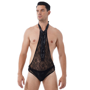 Mens Erotic Bodycon Jumpsuits Floral Lace Deep V One-piece Bodysuit Sissy Nightwear Halter Lace-up Open Butt See-through Leotard