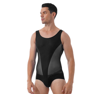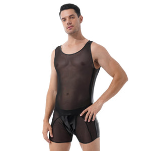 Mens Erotic Jumpsuits Semi-see through Sheer Mesh Patchwork Wrestling Sport Bodysuit Sleeveless Bulge Pouch Leatord Swimsuit