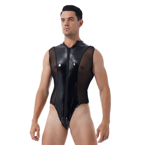 Mens Shiny Metallic Patent Leather Jumpsuits Sheer Mesh Splice Lingerie Sleeveless Double Zipper High Cut Thong Leotard Bodysuit