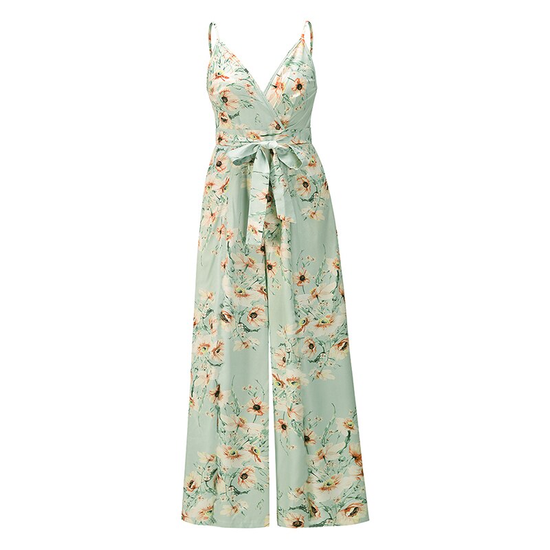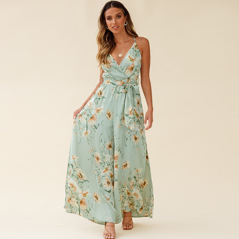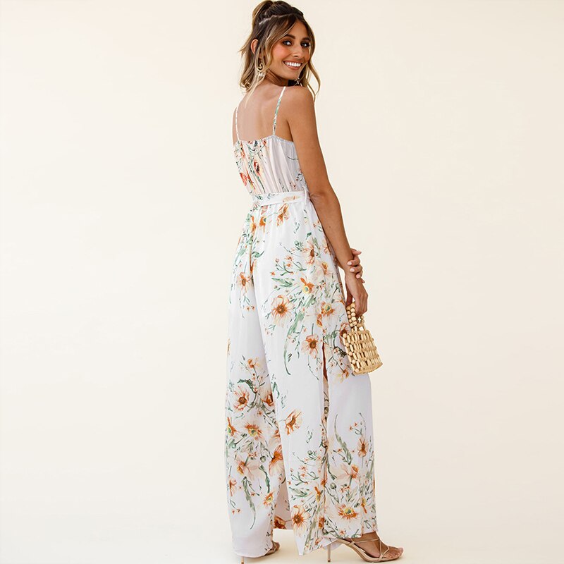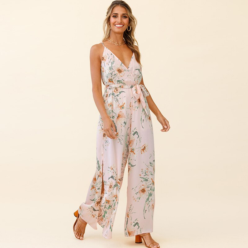 Floral Print Wide Leg Split Fork V Neck Sleeveless Sling Rompers Women Casual Streetwear Beach Party Holiday Jumpsuits