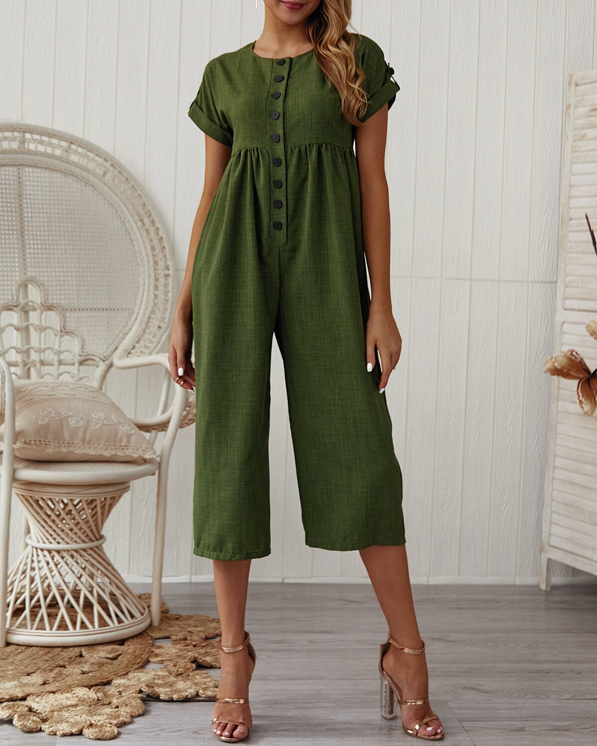 Summer 2021 New Women's Fashion Sexy Solid O Neck Short Sleeve Buttons Tunic Straight Calf Lenght Pants Ladies Skinny Jumpsuits